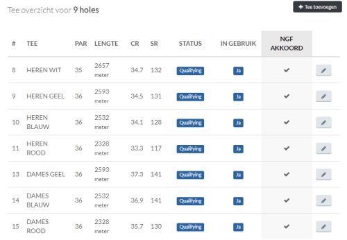 Je kunt ook aangeven dat een baan is uitgebreid met nieuwe tees. Wil je graag dat deze tees qualifying worden, dan kun je een vinkje zetten bij “Aanvraag doen bij NGF voor Course en Slope Rating”.