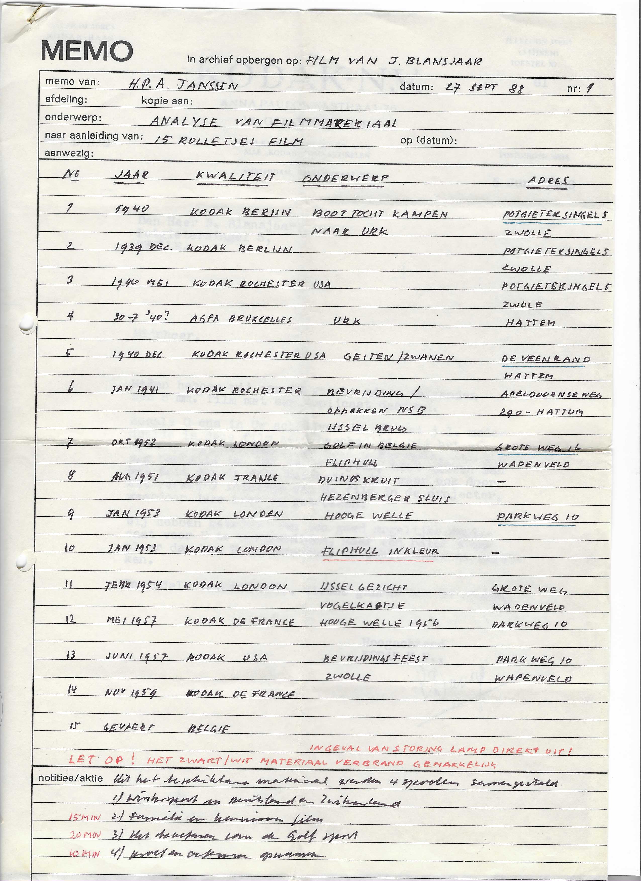 Afgaande op deze notities bestonden er oorspronkelijk vijftien rolletjes film, afkomstig uit de periode 1939-1959. Naar grote waarschijnlijkheid waren ze gemaakt door Johan ‘Prof’ Blansjaar, de jongere broer van Jan, die filmmaker werd (later onder meer voor Polygoon). De beelden komen allemaal van Kodak-filmpjes, waarmee wel vaststaat dat het om '8mm-film' gaat, door Kodak in 1932 in Nederland geïntroduceerd, en gebruikt tot 1965 toen de Super 8 hiervoor in de plaats kwam. De beschrijving van de verschillende filmrolletjes vermeldt ook een bijbehorend adres, waarschijnlijk overgenomen van bijschrijving op de oorspronkelijke rol. Hierin herkennen we twee adressen van Jan Blansjaar: Grote Weg (tegenwoordige Groteweg) 16 en Parkweg 10 in Wapenveld. Eén van de vijftien rolletjes had als onderwerp ’Golf in België’ en kwam uit oktober 1952.